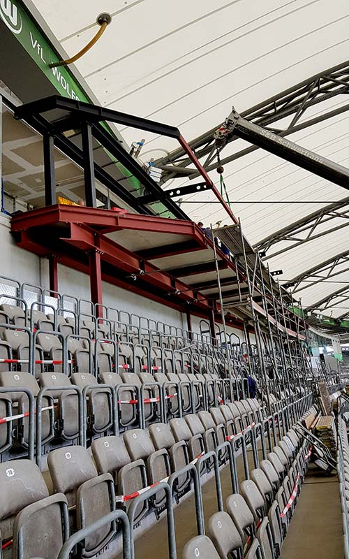Volkswagen Arena KenndatenBauherrVFL Wolfsburg-Fußball GmbHPlanerDelta Bauplanung, BraunschweigFertigstellung2021 Das ProjektUmbau und Erweiterung des Leitstandes mit Einbau einer Aufzugsanlag mit Pfahlgründung. < >